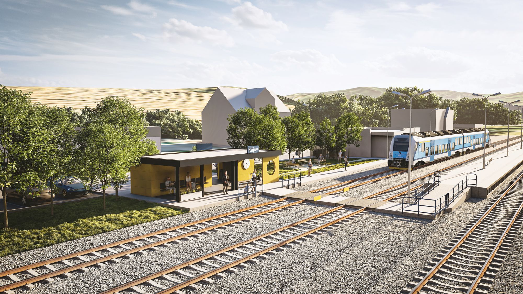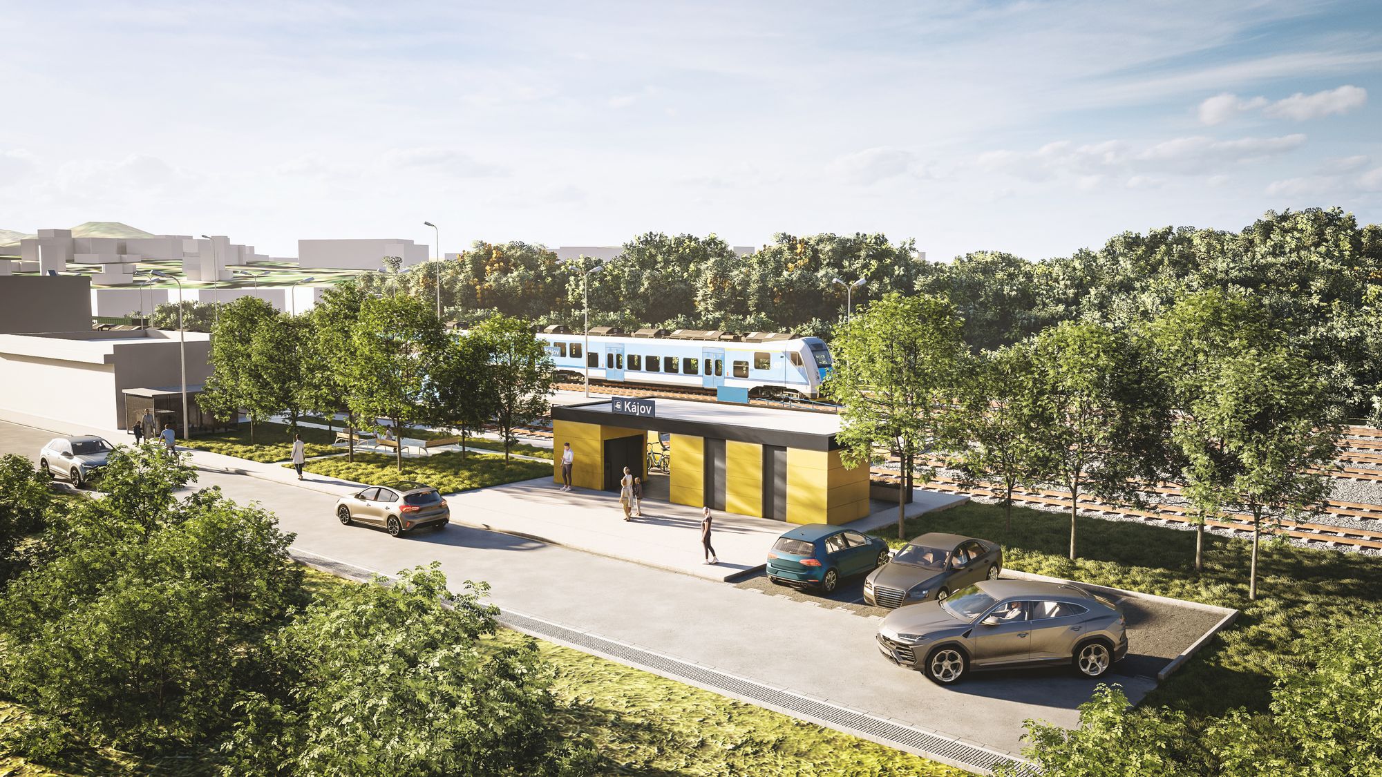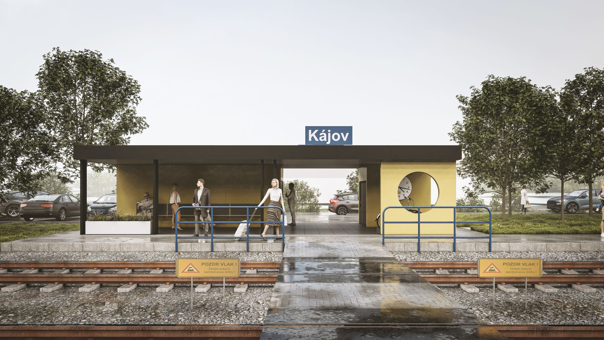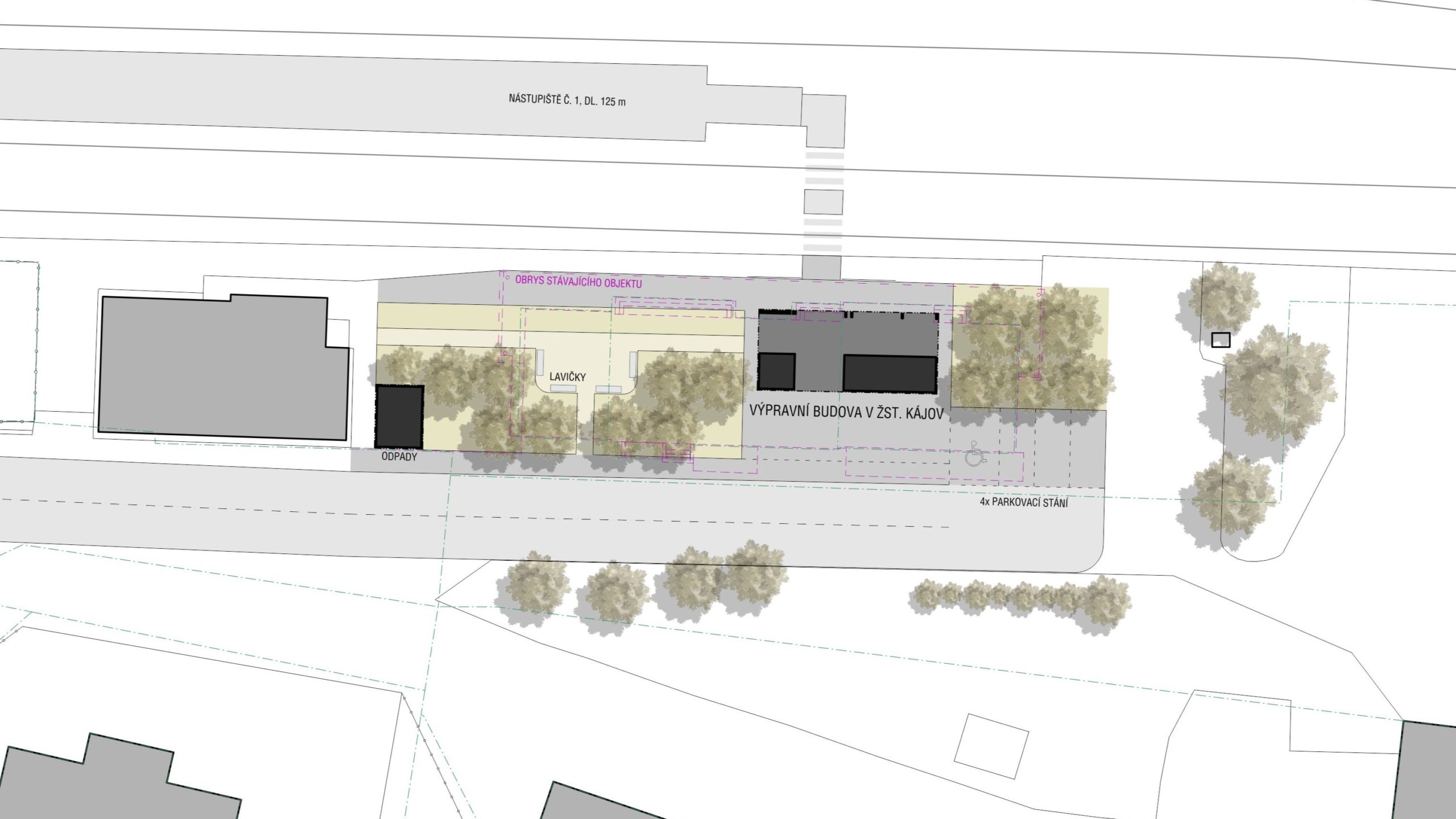 The railway station Kájov is located on the eastern outskirts of the village of Kájov near Český Krumlov, on the line No. 194 České Budějovice - Černý Kříž. The proposed new design of the station is a follow-up to the long-term concept of the construction renewal and modernisation of passenger stations managed by Správa železnic s.o., which aims to bring the existing passenger station buildings to a state suitable for use by the travelling public in the 21st century. The subject of the construction proposal is the complete removal of the existing passenger station building, which is in a state of disrepair, and the construction of a new passenger station building in the form of a roofed waiting room for passengers and tempered stores and substations.