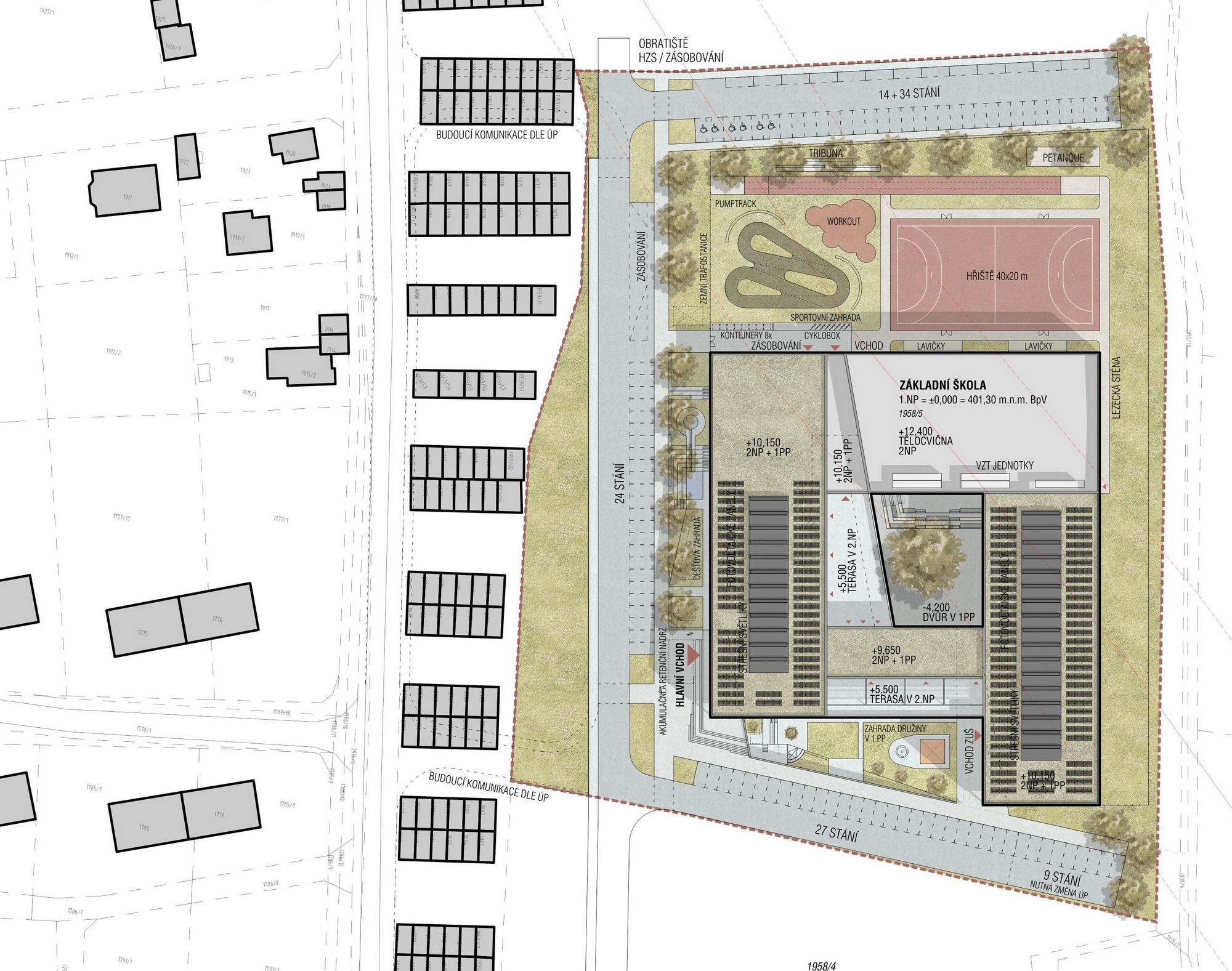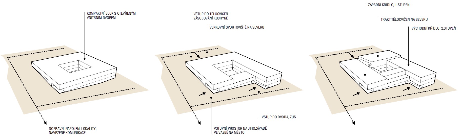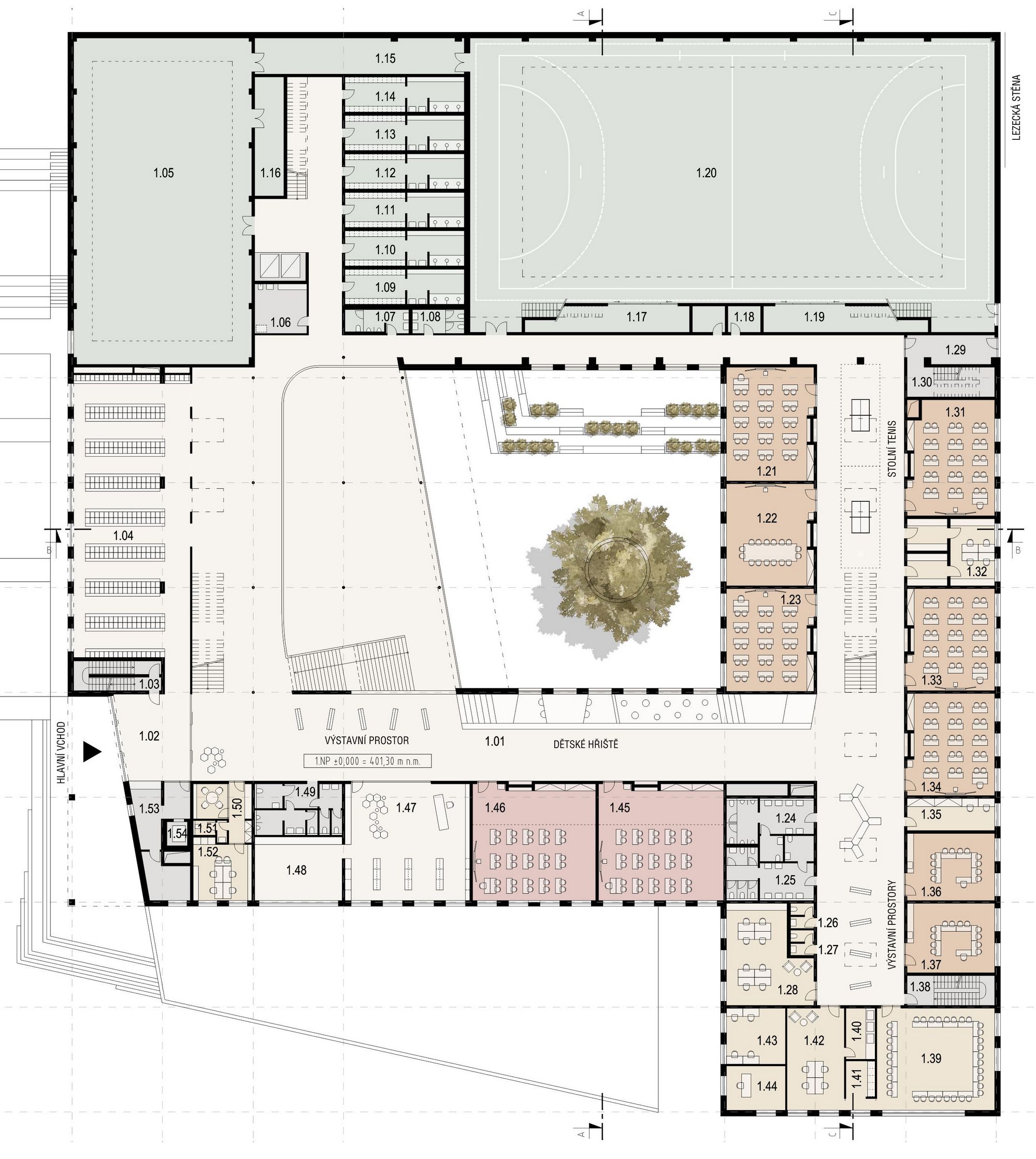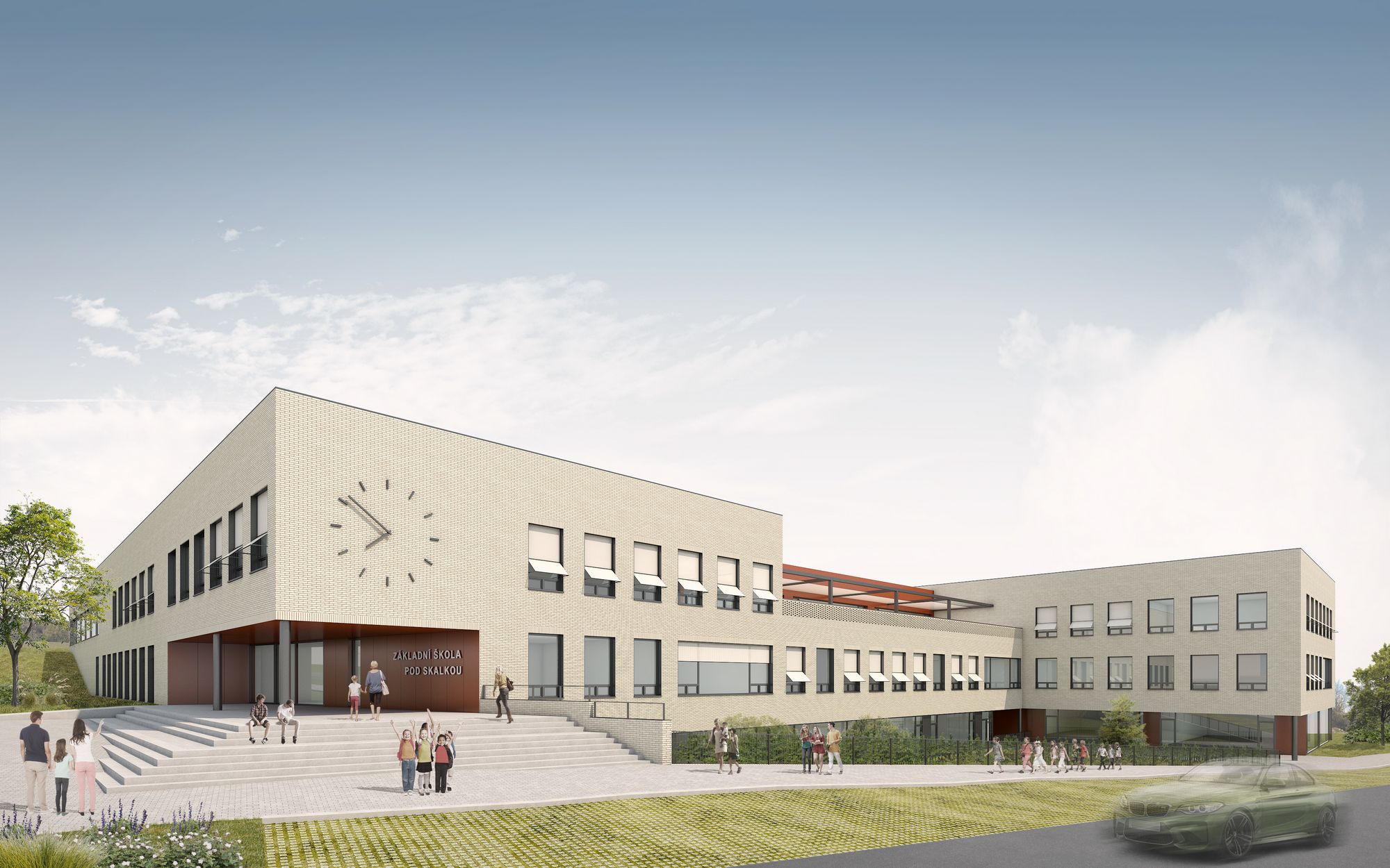 The plot for the Primary School is located on the northeastern edge of Mníšek below Skalka Hill on a southeast-facing slope overlooking the countryside. The site is directly linked to the history of mining and iron ore processing. The Skalka mine adit, which was used to transport mined material to the former lumpworks, runs directly under the school site. In the neighbourhood there is the quarter Staré sídliště, a residential area built in the 1950s for smelters. This theme has been with us during design development and was an inspiration for us in the choice of materials and colour scheme. The proposed mass forms a compact block with an open inner courtyard and reflects the scale of the industrial buildings typical of the north-eastern edge of Mníšek. The saw-tooth roof illuminating the common corridors of the school refer to the rugged roofscape of the lumpworks area.