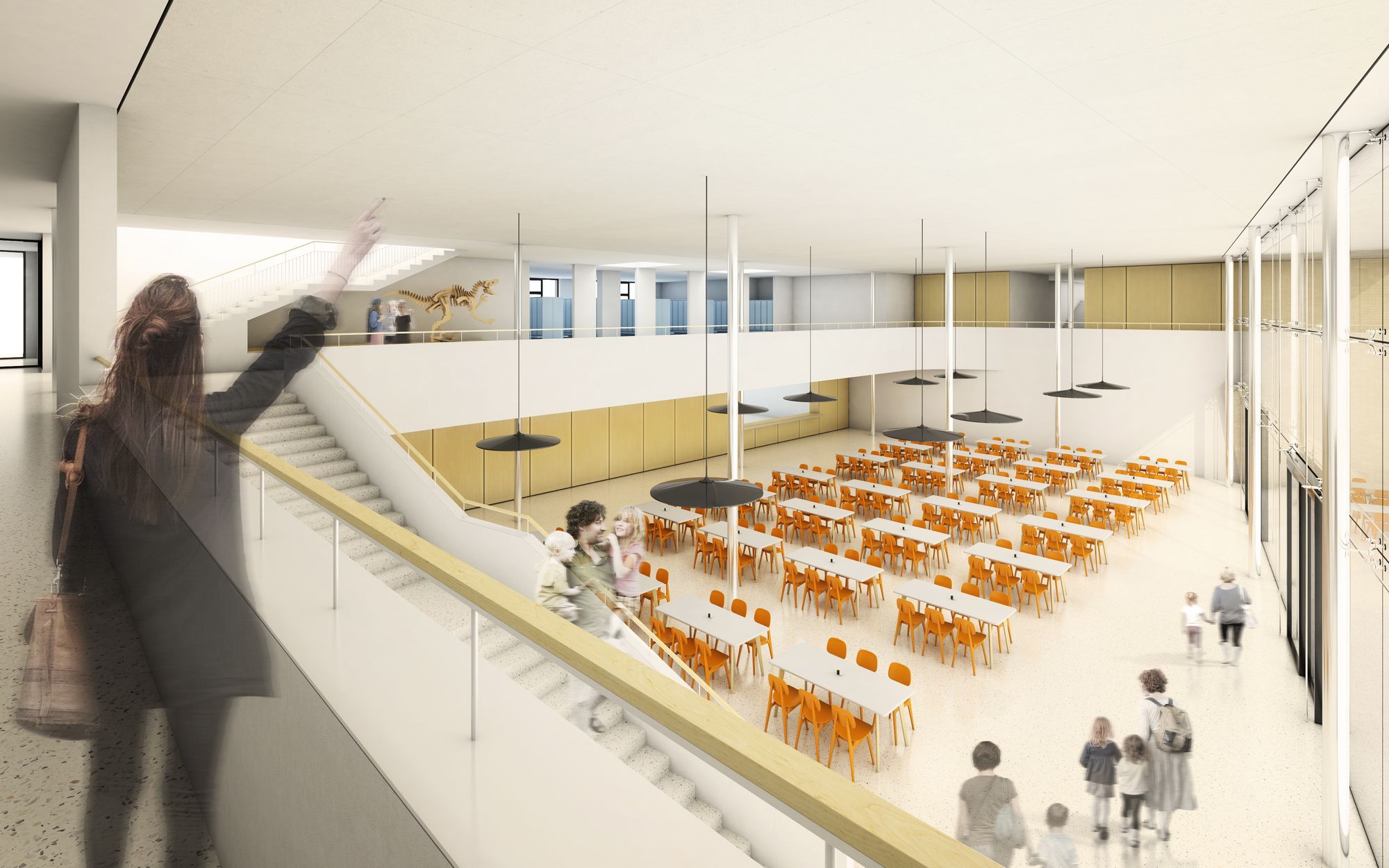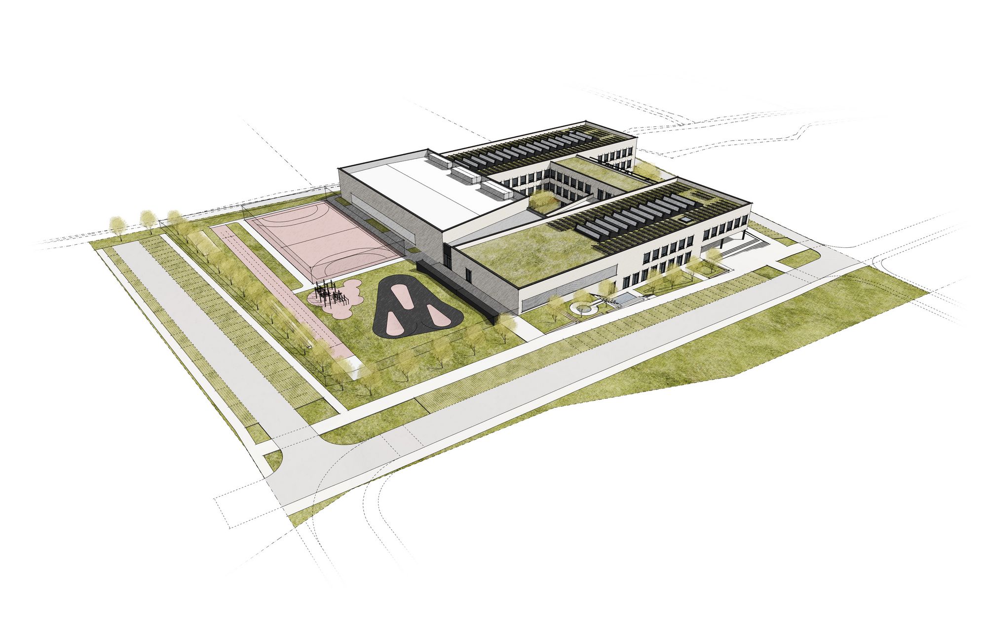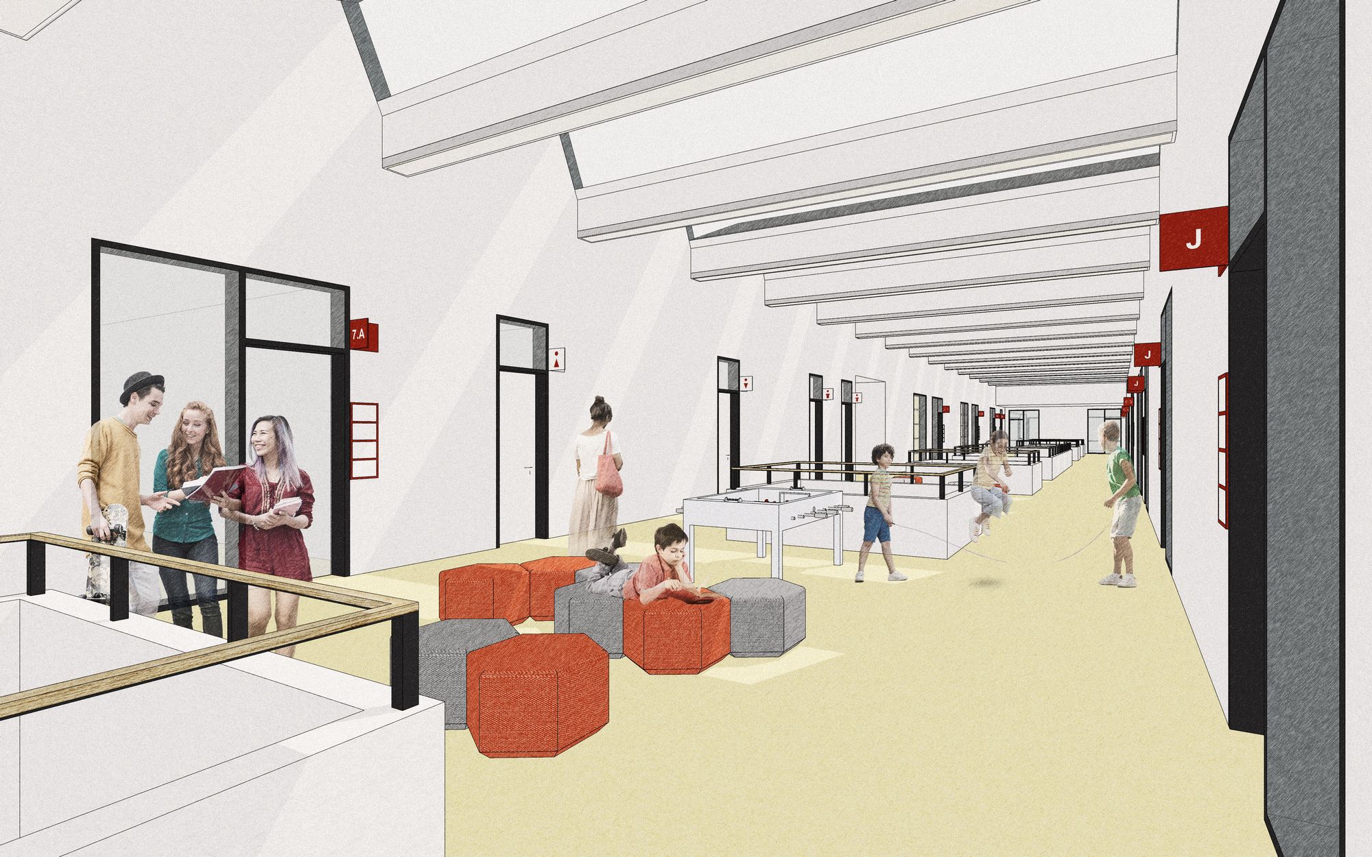 The school, with a capacity of 540 pupils, is divided into a west wing for the entrance area, canteen and first grade, an east wing for the second grade, specialized classrooms, administration and the Art school (with a separate section in the first floor). The south wing is used for studio classrooms, first grades, a school club, psychological counseling and after-school clubs. Gyms are proposed in the northern part of the building with a link to the outdoor sports field. The key space of the school is the spacious corridors which not only serve as a communication space but are designed as a living space. Separately for the first and second grade, a central space between the classrooms creates a play and relaxation landscape illuminated by skylights offering opportunities for informal learning, sports activities and presentation of pupils' school activities. Corridor overlooks visually connect the space with the ground floor, while bringing in natural lighting.