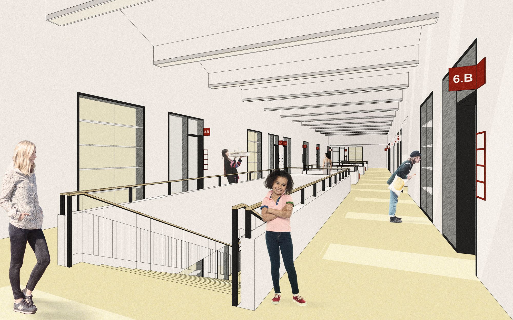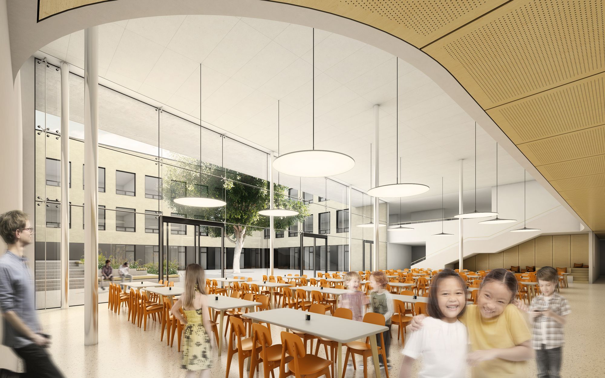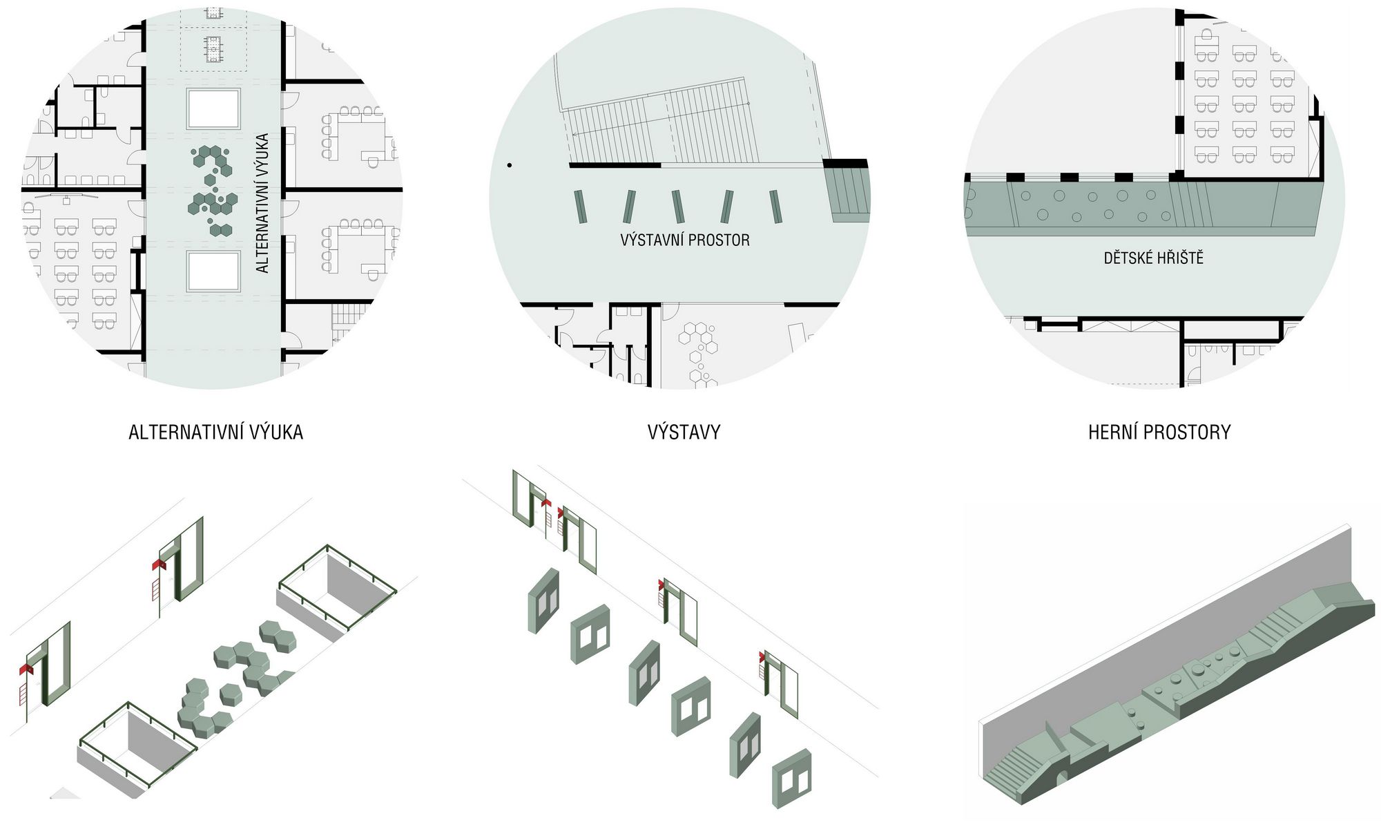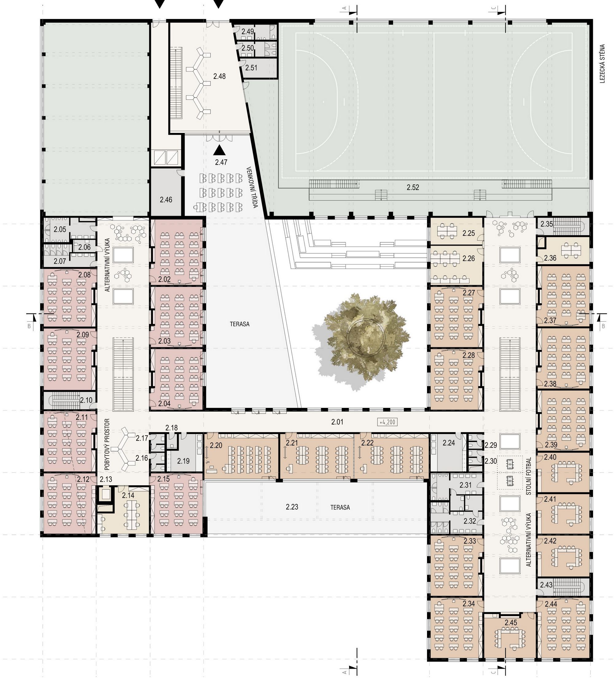 The school, with a capacity of 540 pupils, is divided into a west wing for the entrance area, canteen and first grade, an east wing for the second grade, specialized classrooms, administration and the Art school (with a separate section in the first floor). The south wing is used for studio classrooms, first grades, a school club, psychological counseling and after-school clubs. Gyms are proposed in the northern part of the building with a link to the outdoor sports field. The key space of the school is the spacious corridors which not only serve as a communication space but are designed as a living space. Separately for the first and second grade, a central space between the classrooms creates a play and relaxation landscape illuminated by skylights offering opportunities for informal learning, sports activities and presentation of pupils' school activities. Corridor overlooks visually connect the space with the ground floor, while bringing in natural lighting.