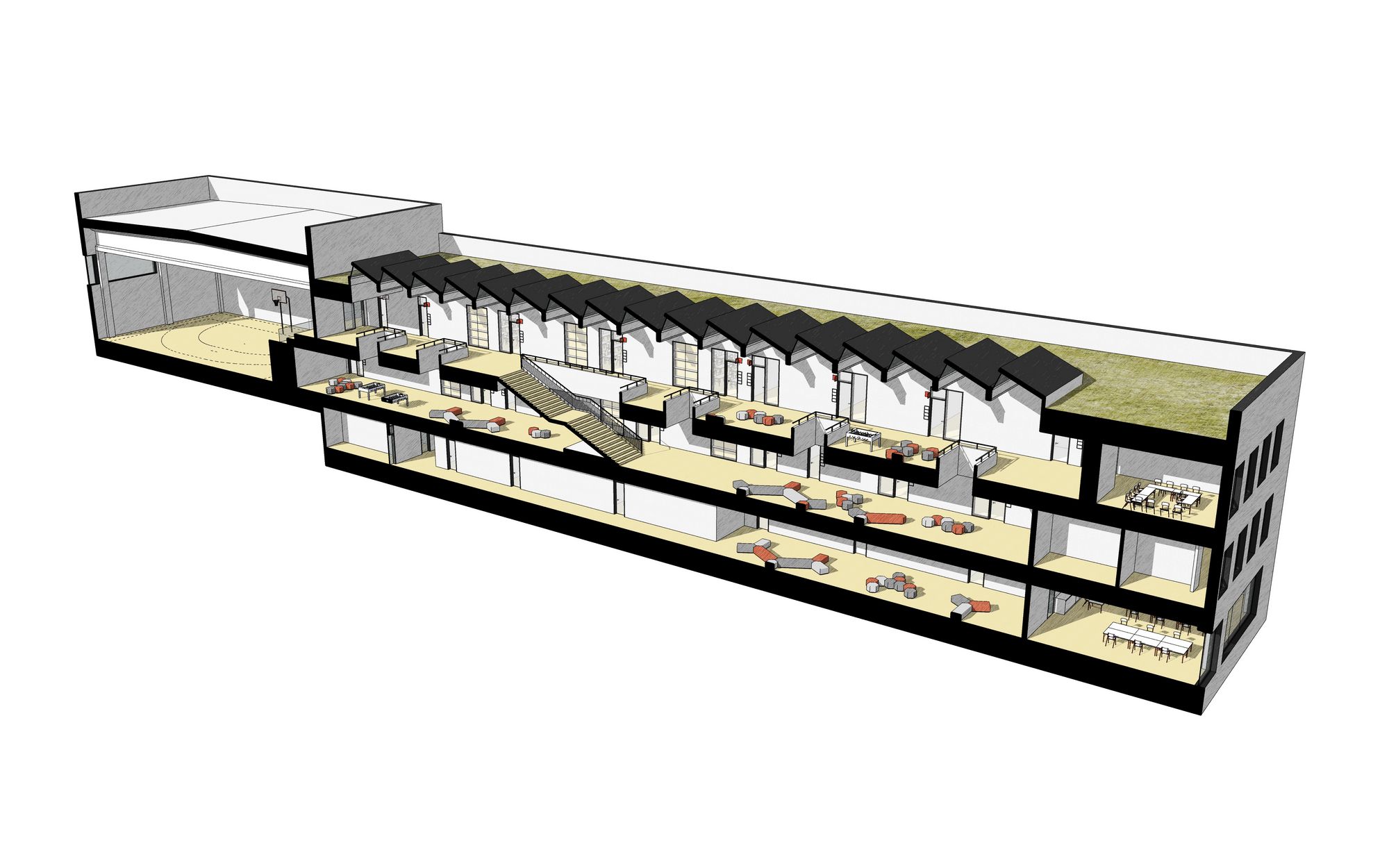 The horizontal mass of the school with two above-ground and one underground floor is cut into the ground due to the slope of the site. From the landscape to the north it appears as a single storey, towards the housing estate as a two storey and in the south east corner the underground storey rises above the ground to allow access to the courtyard and the Art School.