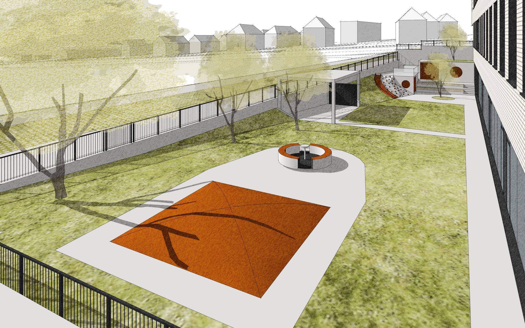 The house is set on the south of the site in a location closer to the town, leaving space for an outdoor sports field to the north. It is designed as a compact block with an open courtyard in the middle at ground floor level. The western edge of the building is parallel to the considered street identified in the masterplan.